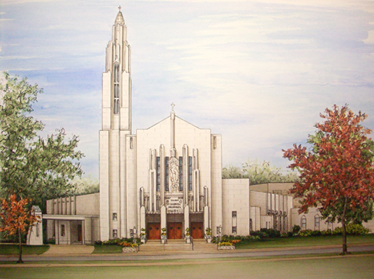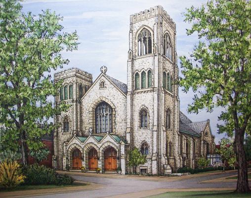 St. Margaret of Scotland Church, pen & ink with acrylic paint washes on paper